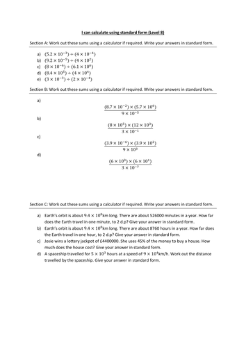 5 107 22 104 e. B Be able to use the x10 button on your calculator. A worksheet where you are given two numbers in standard form to divide together.
